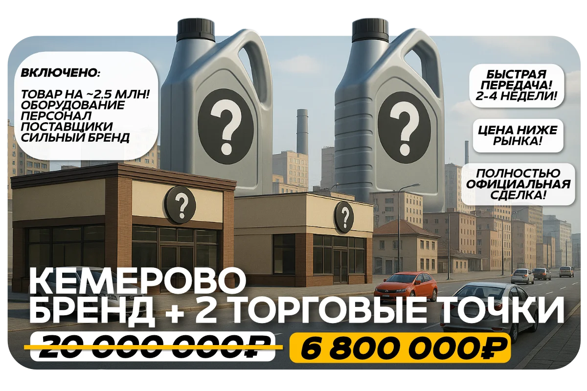 Известный бренд по продаже автомасел (название не раскрывается публично, после заполнения анкеты). Исключительное право на Кемеровскую область. Два работающих (10+ лет) розничных магазина с оборудованием, товаром (≈ 2,5 млн ₽), персоналом и выгодной арендой прямо в центре Кемерово. Продажу ведёт правообладатель бренда.
